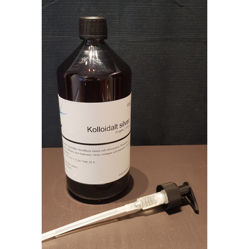 Kolloidalt silver 10ppm 1L tillsammans med en pump som skruvas på istället för korken.